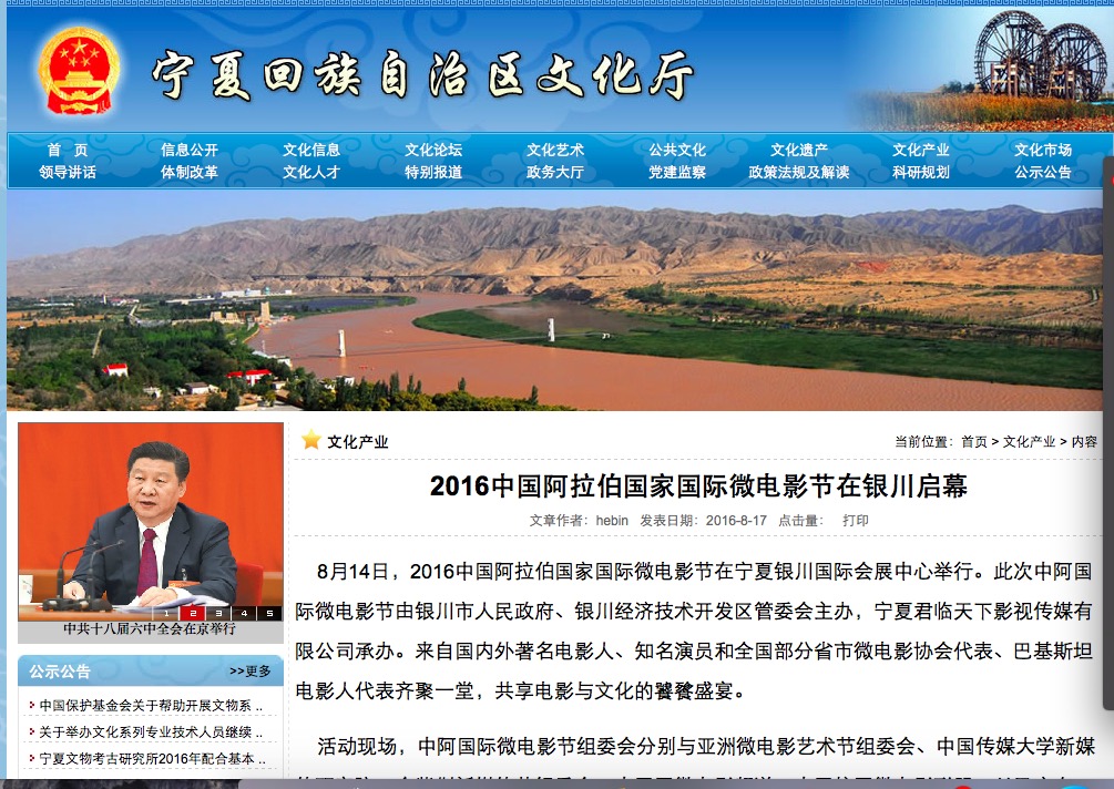 8月14日,2016中國阿拉伯國家國際微電影節(jié)在寧夏銀川國際會展中心舉行。此次中阿國際微電影節(jié)由銀川市人民政府、銀川經濟技術開發(fā)區(qū)管委會主辦,寧夏君臨天下影視傳媒有限公司承辦。來自國內外著名電影人、知名演員和全國部分省市微電影協(xié)會代表、巴基斯坦電影人代表齊聚一堂,共享電影與文化的饕餮盛宴。