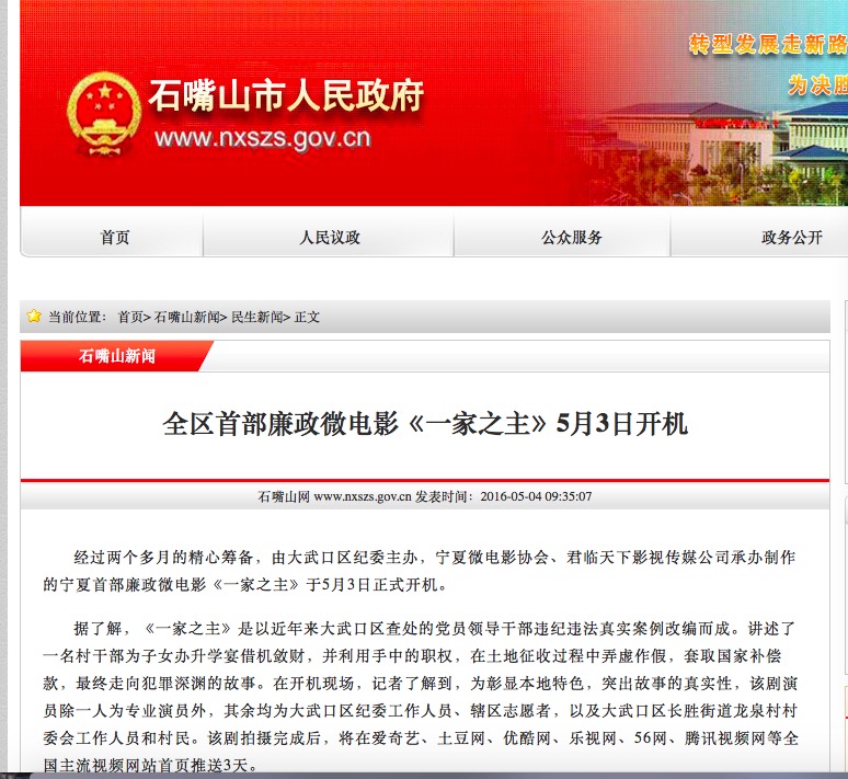 中國(guó)影視娛樂(lè)訊:2016年05月03日,由石嘴山市大武口區(qū)紀(jì)委、寧夏回族自治區(qū)微電影協(xié)會(huì)聯(lián)合出品,君臨天下影業(yè)攝制的寧夏紀(jì)檢監(jiān)察系統(tǒng)首部廉政微電影《一家之主》開(kāi)機(jī)儀式在石嘴山市大武口區(qū)紀(jì)委會(huì)議室舉行。