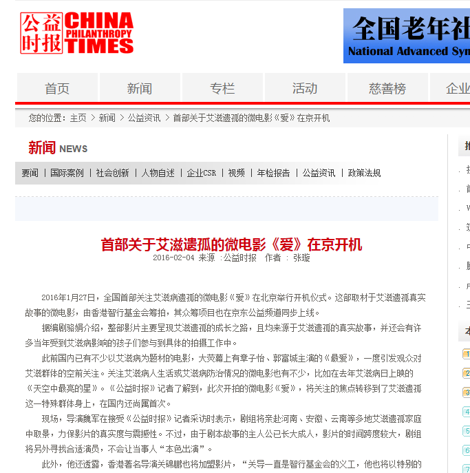 2016年1月27日,全國首部關(guān)注艾滋病遺孤的微電影《愛》在北京舉行開機(jī)儀式。這部取材于艾滋遺孤真實(shí)故事的微電影,由香港智行基金會籌拍,其眾籌項(xiàng)目也在京東公益頻道同步上線。
